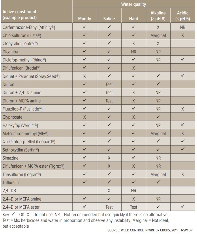 But in the real world this is generally not a option and bore water is often used for spraying. Bore water can be high in bicarbonates making it hard, have a high pH or be saline. All of theses factors affect the efficacy of different herbicides.